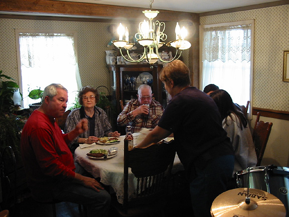 Beginning clockwise with dad's large head: Female Grandparent, Male Grandparent, the top of Jason's head, the back of Ginger, then mom.
